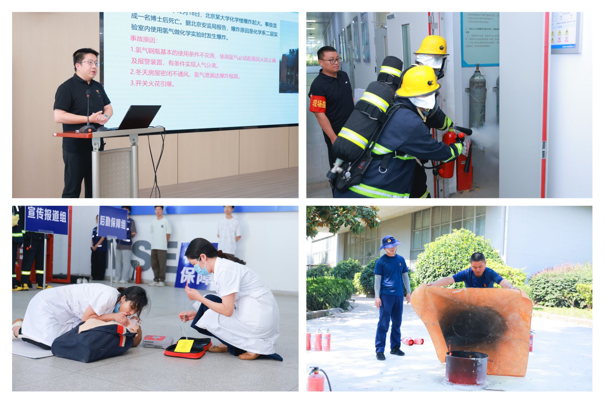 本次活动由国有资产与实验室管理处主办,分为实验室气瓶特种设备安全知识培训和气瓶气体泄露爆炸应急演练两部分。南京市安委办危险化学品专家库成员、苏交科集团(安全)科学研究院有限公司高级工程师王超为参会人员详细讲解了实验室危险气体泄漏危害及安全防护与事故应急处置相关知识。应急演练则以某实验室内的氢气气瓶发生泄露并引发爆炸为典型案例,围绕第一时间师生疏散、事故及时上报、现场封锁警戒、应急指挥部组建、医护应急救援伤情处置、小范围火情现场灭火、危险源处置消除、洗消除污、现场恢复等应急救援环节展开,各环节安排紧凑,有序进行。