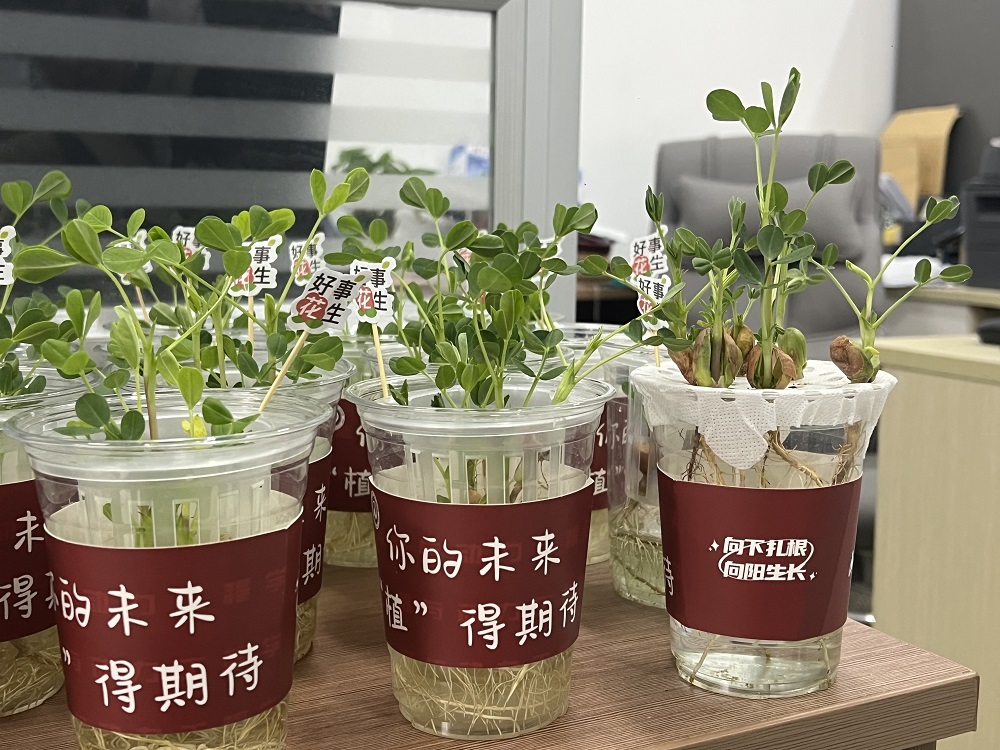 “为考研学生送祝福已连续开展多年,是学院的一项传统活动,也是考研学子共同的珍贵回忆。我们一直在思考,什么样的心意既有思想深度又有人文温度呢?”毕业班辅导员介绍,缘起学院的‘植茁’德育工作室,我们想通过亲手种植的植物告诉同学们,一定要向下扎根,坚信忙有所得,耕有所获。”这样的创意得到了同学们的积极响应,学院提前2个月开始筹备,选种、泡发、促芽、移盆、日常养护......每一株苗都是从种子孕育成长起来的,同学们能够清楚看到根系和植株的一步步发育,直到郁郁葱葱。