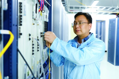 胡峰在机房进行网络设备组网调测。 凯发供图