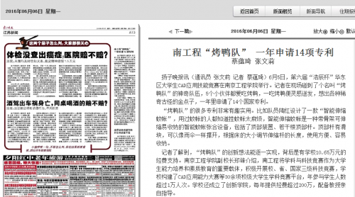 扬子晚报讯(通讯员 张文莉 记者 蔡蕴琦)6月5日,第六届“浩辰杯”华东区大学生CAD应用技能竞赛在凯发k8官网举行。记者在现场碰到了个名叫“烤鸭队”的神奇队伍,5个小伙伴都爱吃烤鸭,一吃烤鸭便灵感迸发,想出各种稀奇古怪的金点子,一年里申请了14个国家专利。