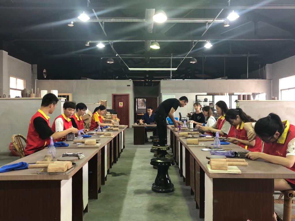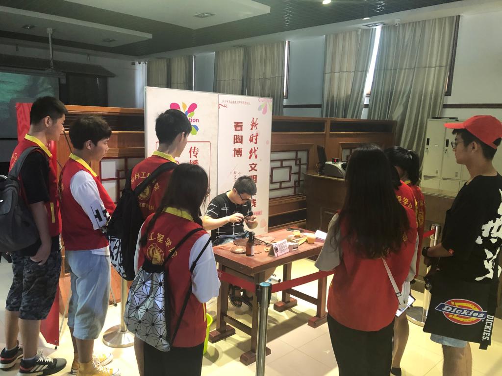 上午,同学们来到了宜兴陶瓷博物馆。在工作人员的带领下,团队成员们参观了精陶、美彩陶、均陶、青瓷等展厅,了解了各类陶瓷的相关文化知识。同学们在这里感受到了历代陶瓷艺术创造的文化底蕴和艺术魅力。宜兴陶瓷博物馆向同学们展示了各个历史时期陶瓷艺术发展的艺术特色和多样风格,同学们纷纷表示感悟到了中华文化的博大精深。下午,小分队成员们来到宜兴市陶壶实训基地,在工艺老师的带领下,队员们亲身实践、动手操作,感悟中华匠魂。之后,同学们亲手设计制作出一个个属于自己的陶瓷作品,并在茶壶中融入中国元素,为建国70周年献礼。实训过后,“师傅们”为同学们煮茶斟茶、细说茶道,同学们更加深刻地了解了我国源远流长的传统文化。大家纷纷表示,要传承和发扬中华民族宝贵的艺术遗产,在新时代为精神文明建设和物质文明建设作出积极的贡献。
