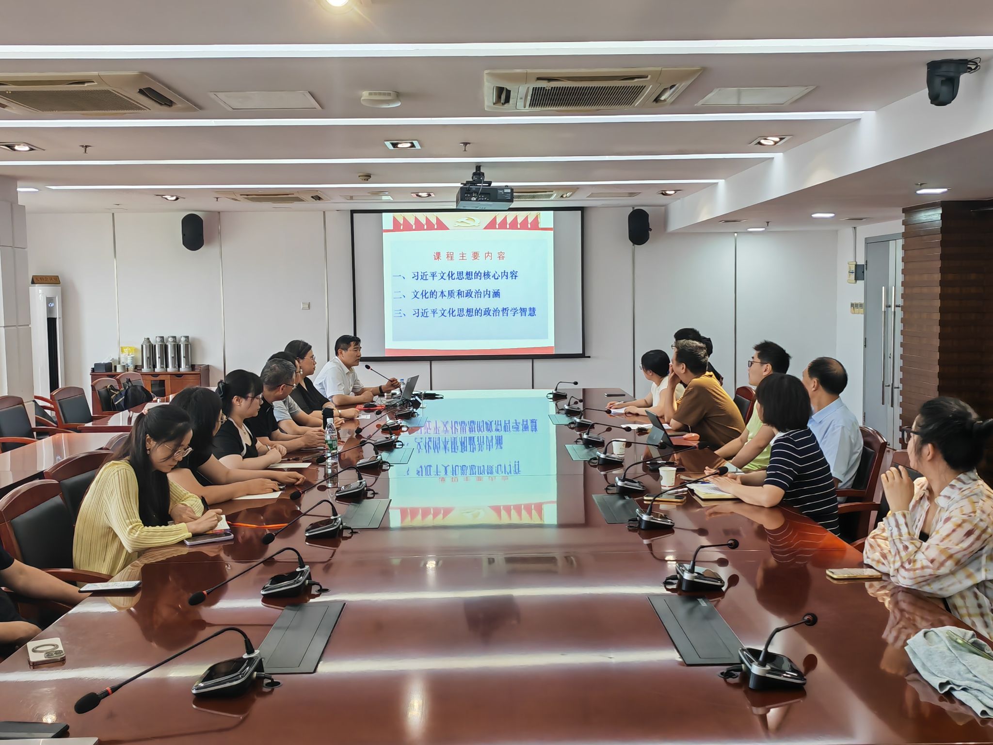 王伟教授围绕习近平文化思想的核心内容、文化本质与政治内涵、政治哲学智慧三大维度展开深入讲解。他系统梳理习近平文化思想的形成脉络与理论框架,重点阐释了 “九个坚持”“两个结合”等理论成果的深刻内涵。通过中西政治文化比较和经典案例分析,生动解读了习近平文化思想所蕴含的政治哲学智慧。互动环节中,教师们就“习近平文化思想如何融入思政课教学”“传统文化与现代政治的结合路径”等问题与王伟教授展开深入探讨,现场学术氛围浓厚,互动热烈。